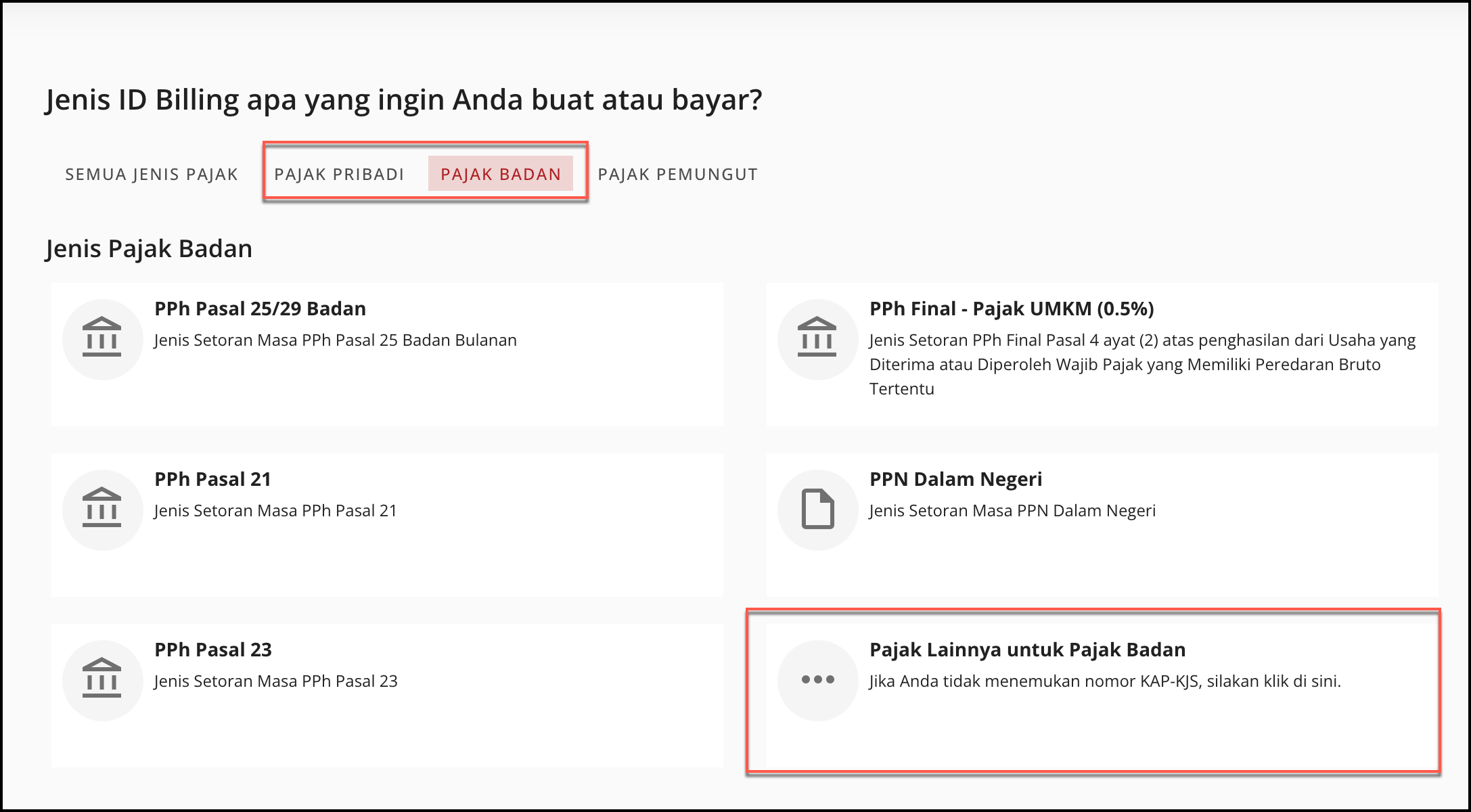 - Pilih Pajak Lainnya untuk Pajak Badan,