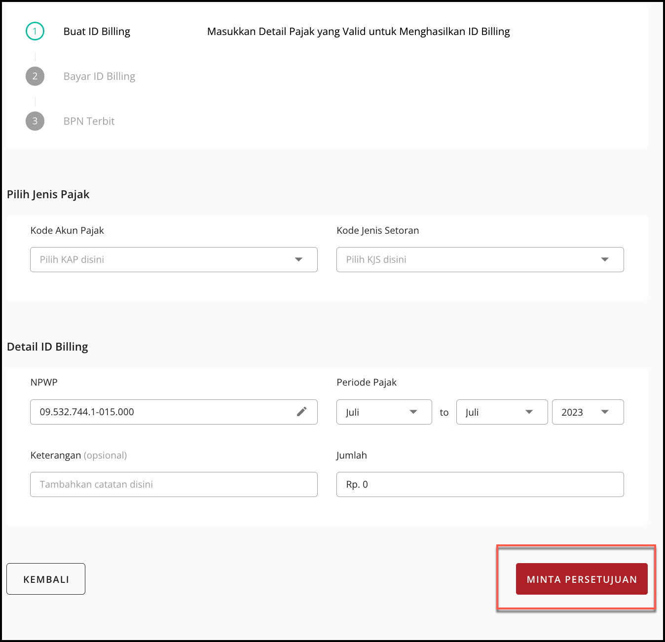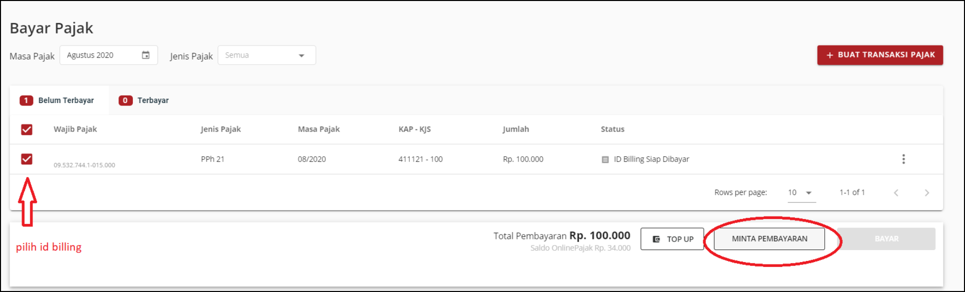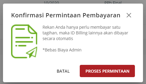 - Pilih ID billing kemudian klik “Minta Pembayaran”