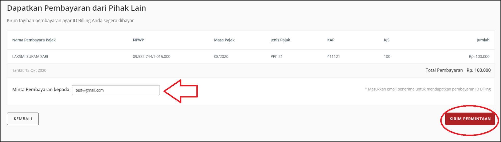 - Silakan isi email klien Anda ingin dikirimkan, kemudian klik “Kirim Permintaan” lanjutkan dengan klik “Proses Pembayaran”. Dengan mengirim “permintaan” artinya Anda sebagai konsultan menagih pembayaran ID Billing ke klien/rekan Anda.
