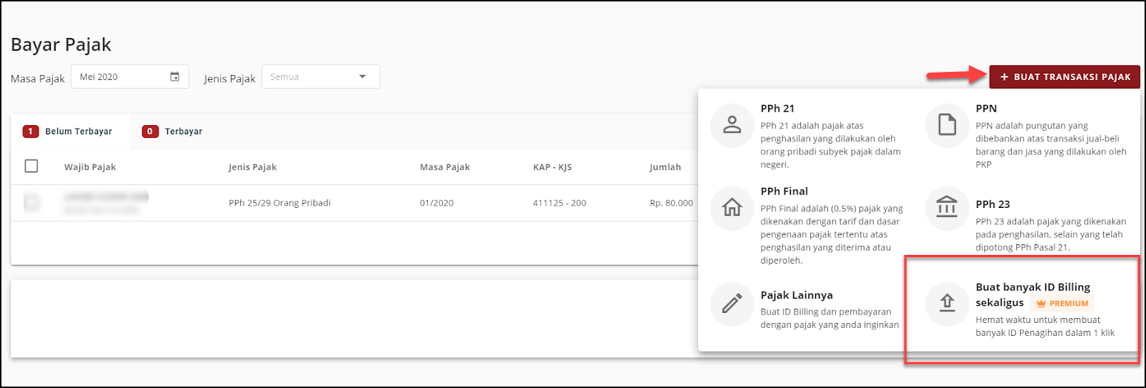 - Pilih masa pajak yang ingin dibuat, lalu klik “+ Buat Transaksi Pajak”,