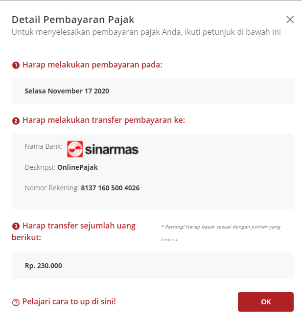 - Klien Anda akan menerima email tagihan yang berisikan 1 kode pembayaran untuk beberapa id billing yang sudah ditentukan. Perhatikan pada tanggal pembayaran, Nomor rekening dan total nominal pajak.