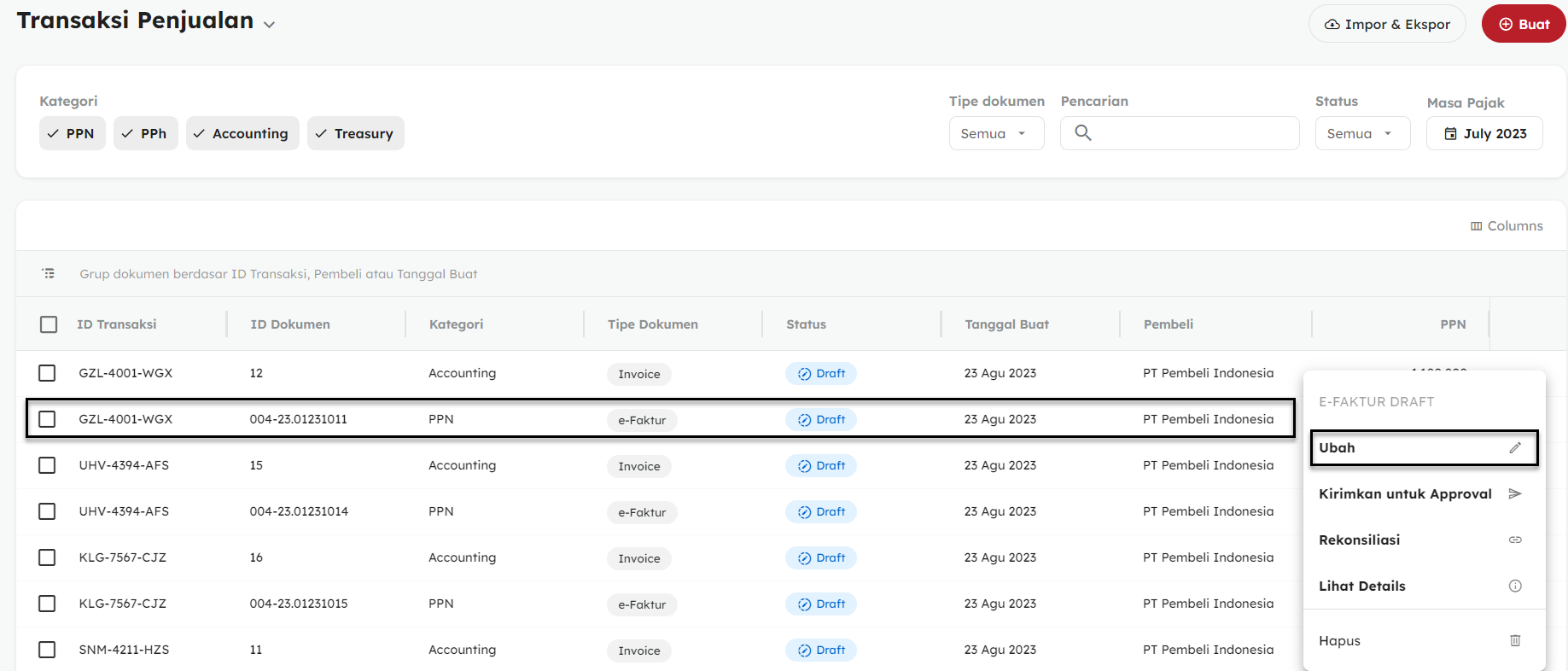 - Pilih Masa Pajak Transaksi Draft yang dimaksud, Klik Icon Titik Tiga lalu pilih opsi Ubah