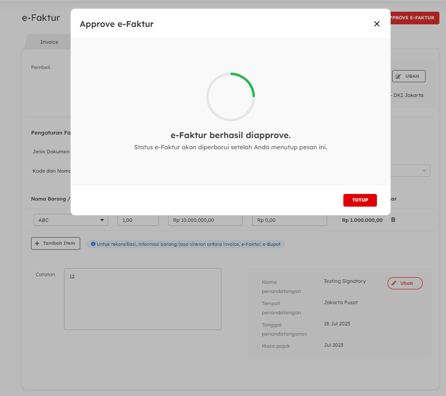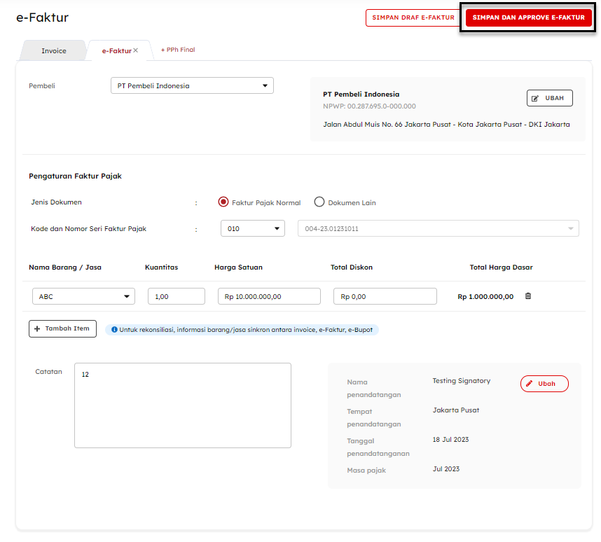 - Silakan lakukan perubahan yang diinginkan Baik pada Tab Invoice maupun eFaktur, Jika sudah sesuai silakan klik tombol Simpan dan Approve