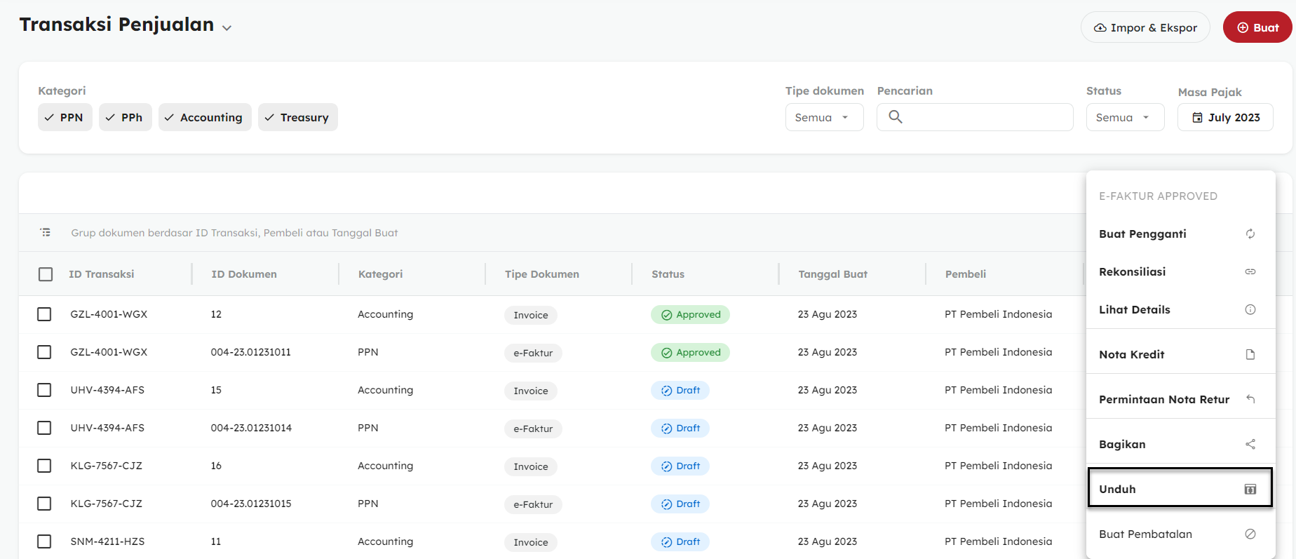 - Anda bisa mengunduh PDF Faktur Pajak ketika status eFaktur sudah terapproved. Silakan klik icon titik tiga lalu pilih opsi Unduh