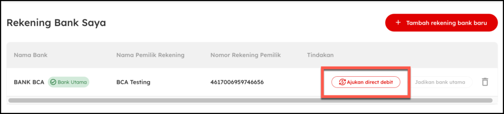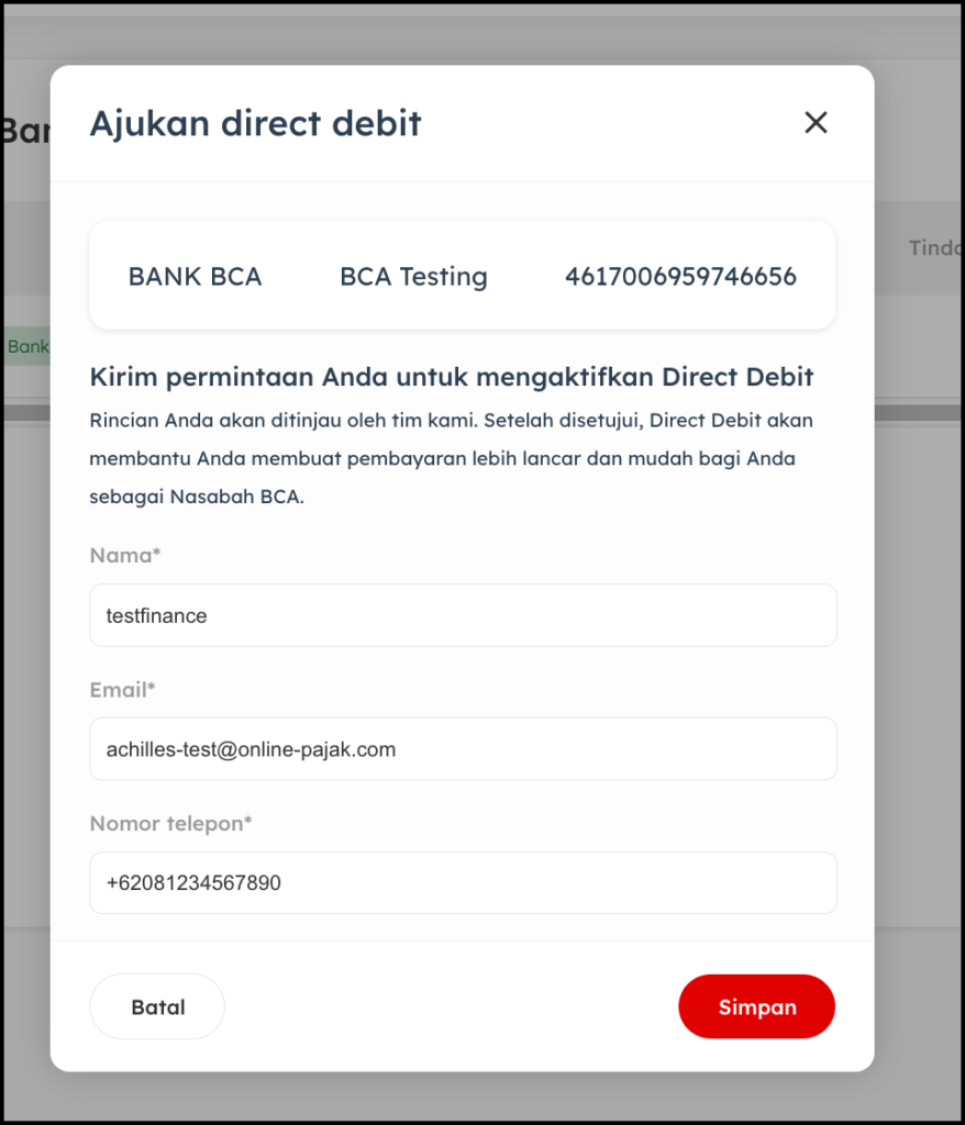 Setelah pengajuan dikirim melalui menu Akun Bank, berikut tahapan aktivasi Direct Debit: