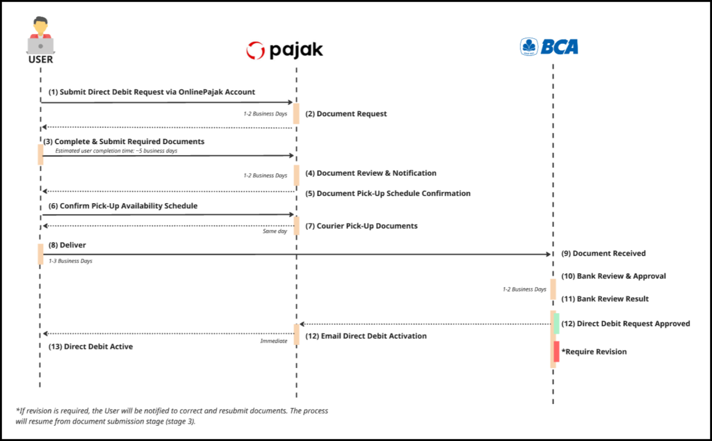 | Cara mengaktifkan BCA Direct Debit? | 1. Ajukan permintaan Direct Debit BCA melalui akun OnlinePajak Anda 2. Buka menu Pengaturan → Akun Bank → pilih rekening BCA → klik Ajukan Direct Debit 3. Anda akan menerima email permintaan dokumen dari OnlinePajak 4. Lengkapi dan kirimkan dokumen yang diperlukan sesuai dengan instruksi pada email 5. Dokumen Anda akan ditinjau oleh OnlinePajak 6. Dokumen fisik (hardcopy) akan dijemput oleh Kurir sesuai jadwal yang telah dikonfirmasi 7. Dokumen akan ditinjau oleh pihak BCA 8. Setelah disetujui, Direct Debit akan diaktifkan dan Anda akan menerima Direct Debit Activation email |