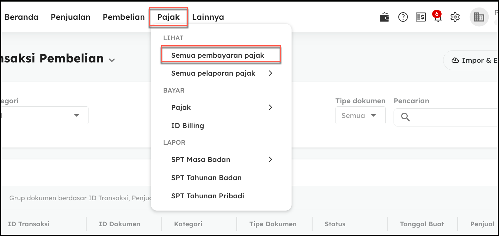 - Buka menu Pajak dan pilih Semua Pembayaran Pajak,
