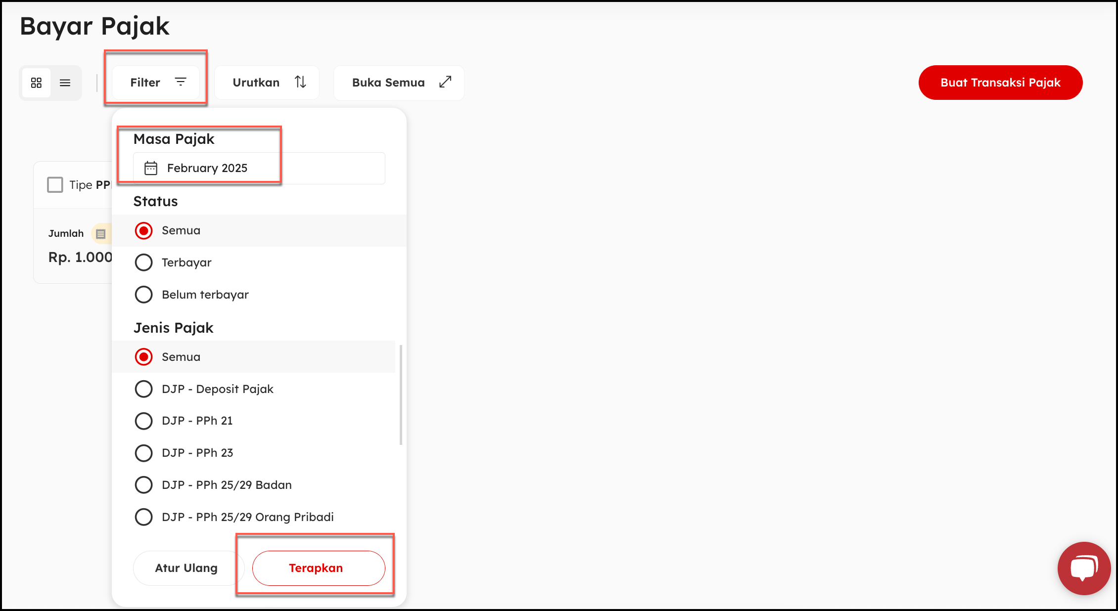 - Klik Filter, pilih Masa Pajak yang ingin dilihat, lalu klik Terapkan.