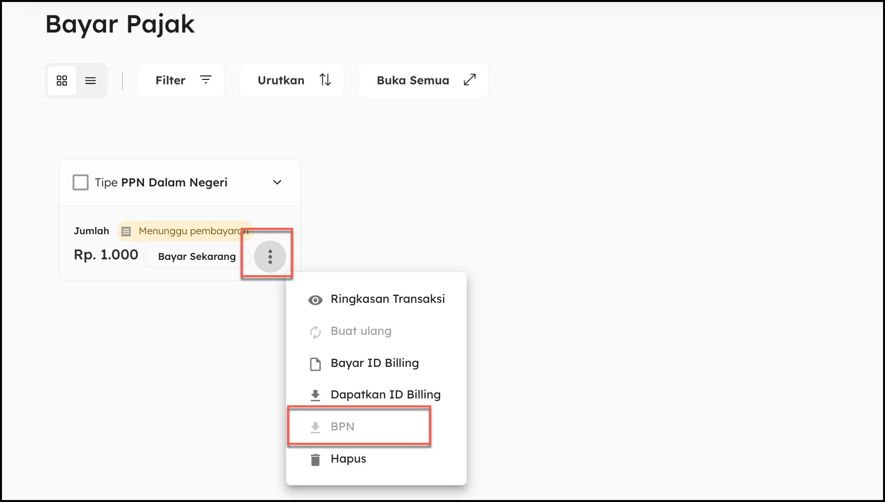 - Cari transaksi pembayaran, klik ikon tiga titik, pilih BPN, dan pastikan statusnya sudah Berhasil.