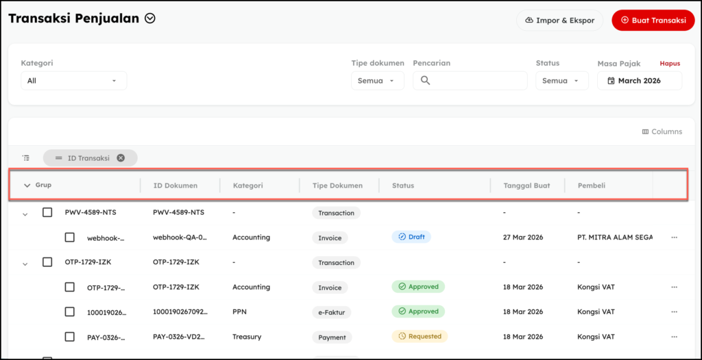 Semua dokumen yang terkait dalam satu transaksi telah digabungkan menjadi satu ID Transaksi yang terpisah. Dokumen tersebut meliputi invoice, eFaktur, nota retur, eBupot (sesuai dengan transaksi yang dibuat). Ini memudahkan proses monitoring transaksi karena semua informasi dapat ditemukan dengan mudah dalam satu ID Transaksi, caranya: