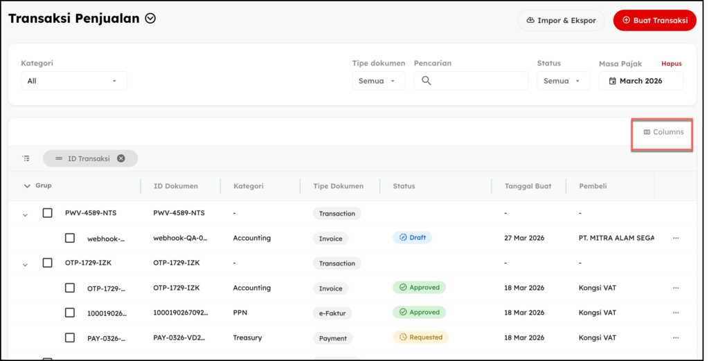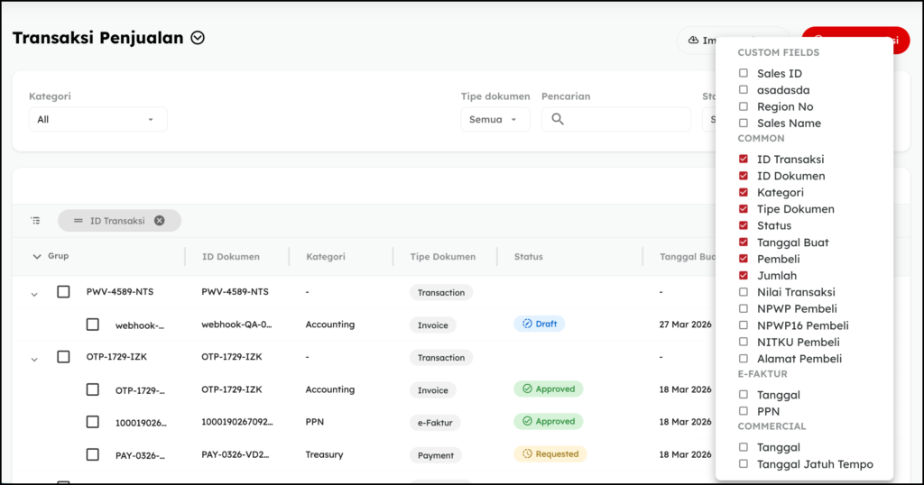 Tampilan utama menu Transaksi sangat memudahkan Anda untuk mengelola dan mengakses dokumen transaksi dengan cepat dan efisien. Anda dapat melihat dokumen yang terkait dengan setiap transaksi yang dilakukan dengan hanya beberapa klik saja, Anda dapat mengelompokkan dokumen berdasarkan transaksi, tanggal pembuatan, status, dan sebagainya. Fitur ini sangat berguna bagi pengguna yang sering melakukan transaksi dan memerlukan akses cepat ke dokumen yang diperlukan. Dengan fitur ini sangat membantu dalam meningkatkan efisiensi dan produktivitas dalam mengelola dokumen transaksi.