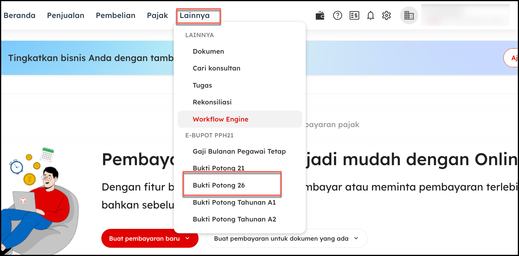 - Masuk ke Menu yang Sesuai. Pilih menu “Lainnya”, lalu klik “Bukti Potong 26”.