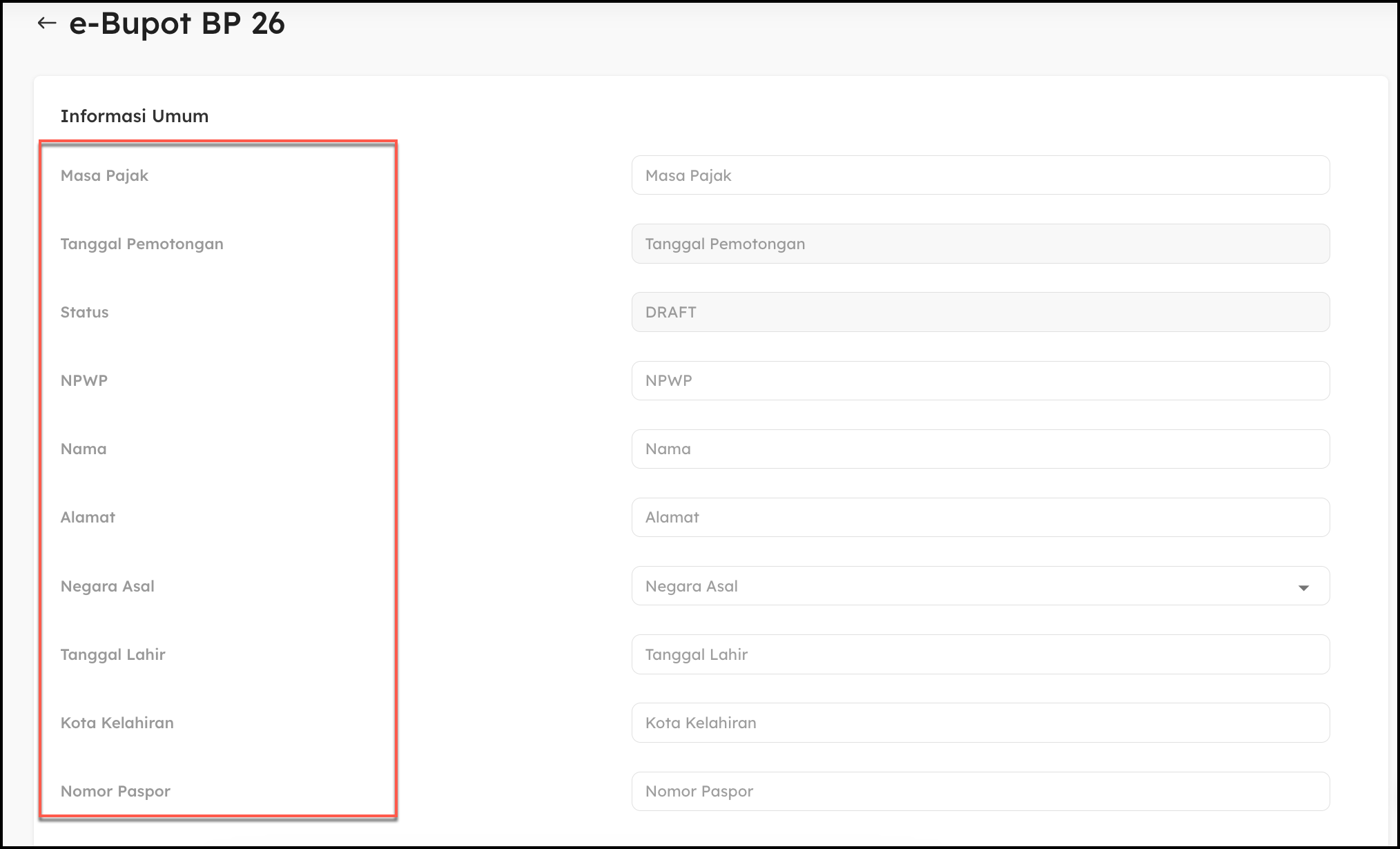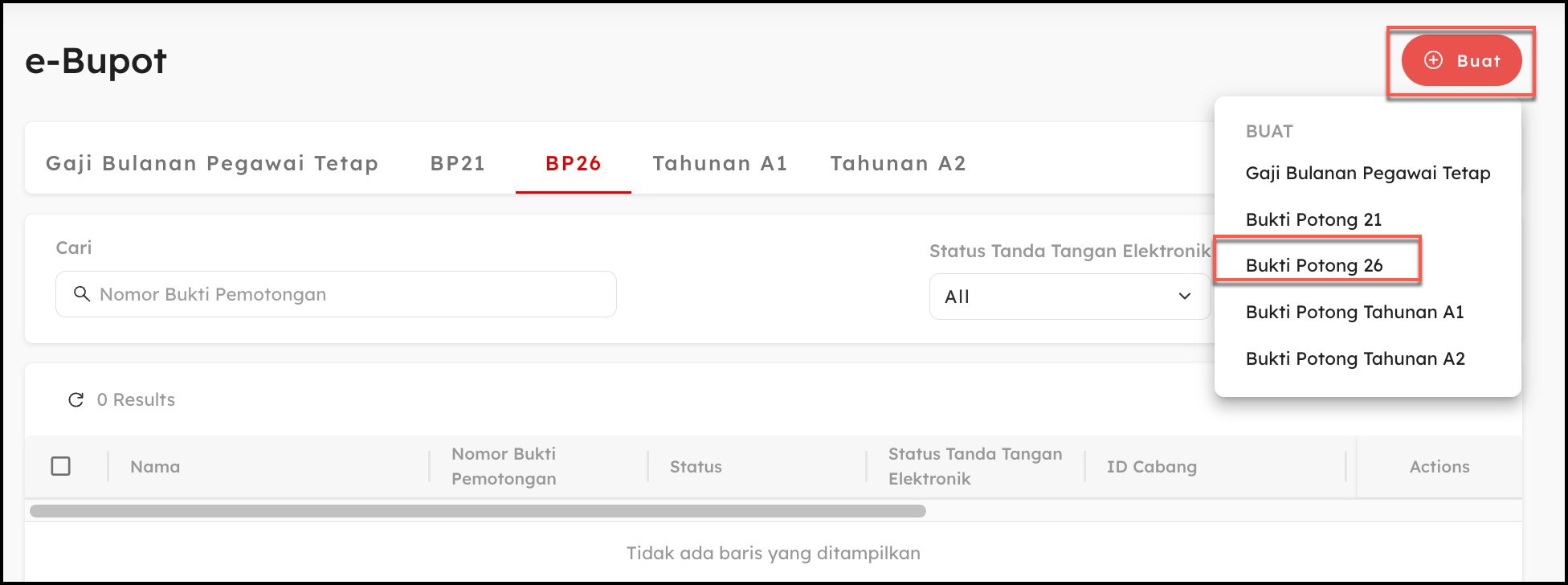 - Buat Bukti Potong 26. Klik tombol “Buat”, lalu pilih “Bukti Potong 26” untuk mulai mengisi data yang diperlukan.