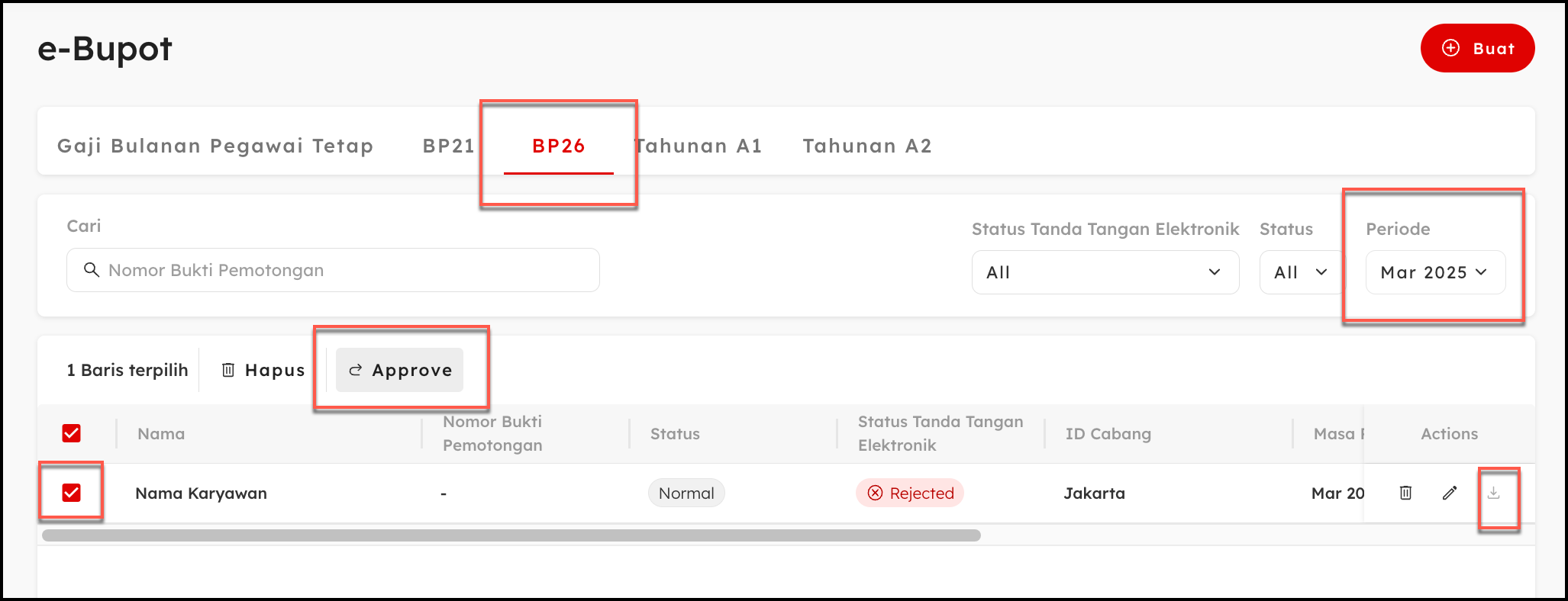 - Review dan Setujui Bukti Potong. Kembali ke halaman daftar Bukti Potong 26 (BP26). Pastikan masa pajak yang tertera sudah sesuai. Centang kolom karyawan yang sesuai, lalu klik “Approve” untuk menyelesaikan proses.