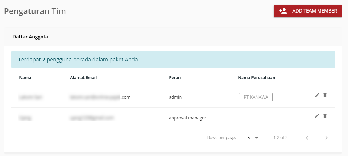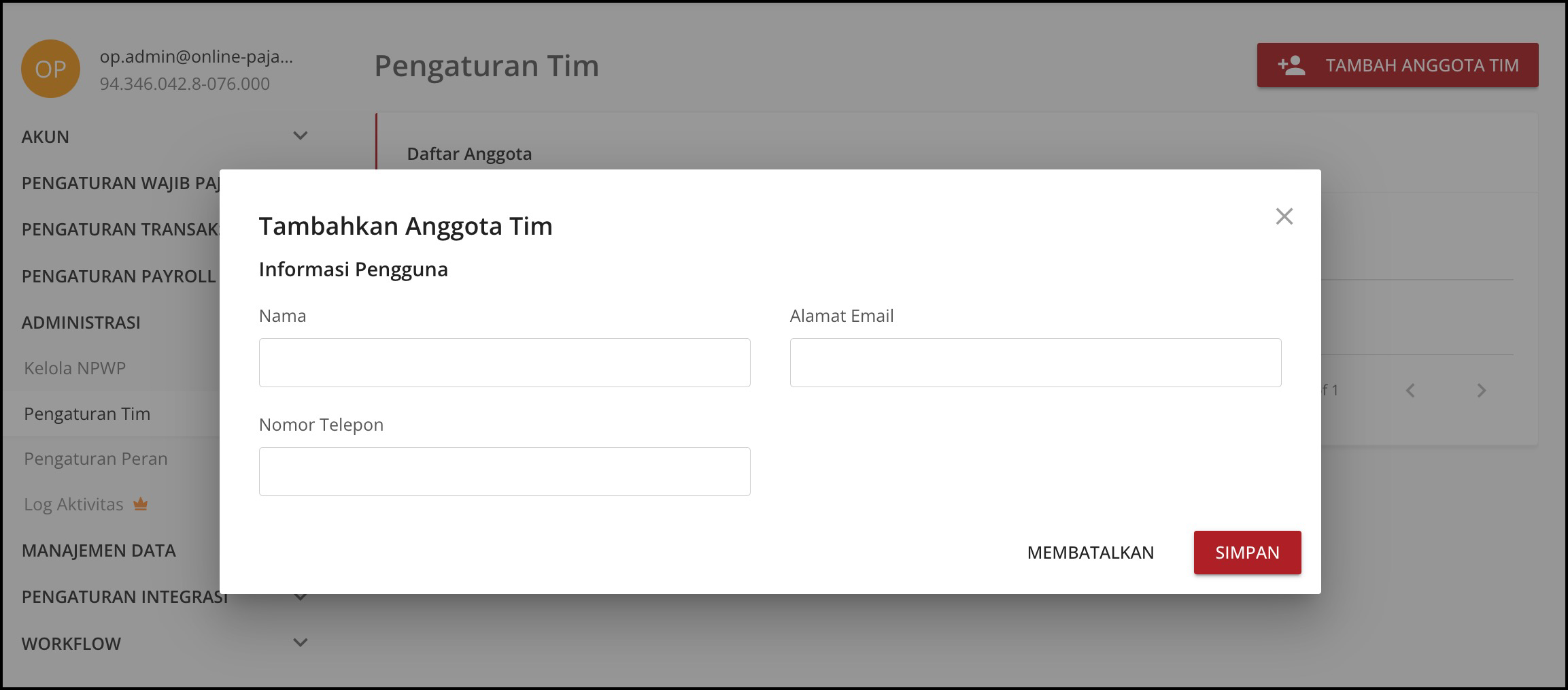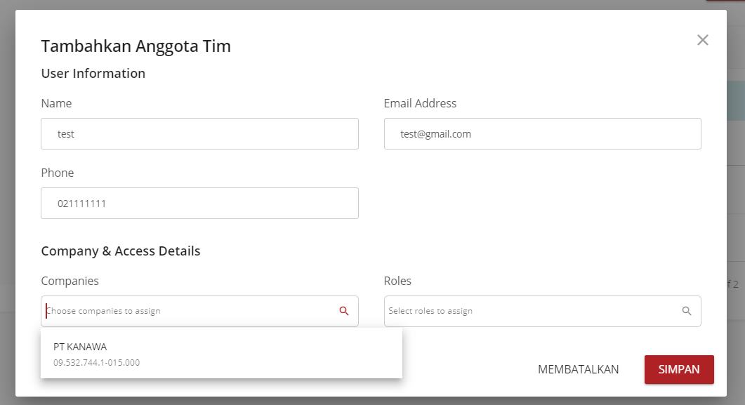 - Klik Tambah Anggota Team, lengkapi dengan Nama, Alamat email (yang sudah terdaftar) dan nomor telepon, kemudian Simpan