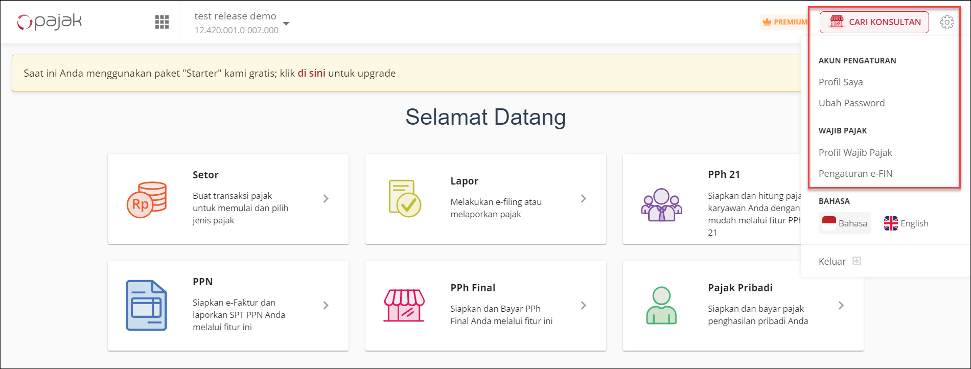 - Mengakses aplikasi OnlinePajak. Jika belum memiliki akun, daftar di tautan e-Filing pajak ini. Setelah berhasil membuat akun, silakan login dan pilih icon Gear