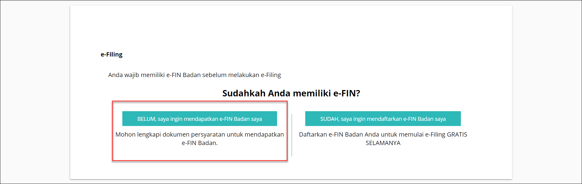 - Berikutnya Anda akan dihadapkan pada halaman pertanyaan seperti di bawah ini. Klik Belum, saya ingin mendapatkan e-FIN.