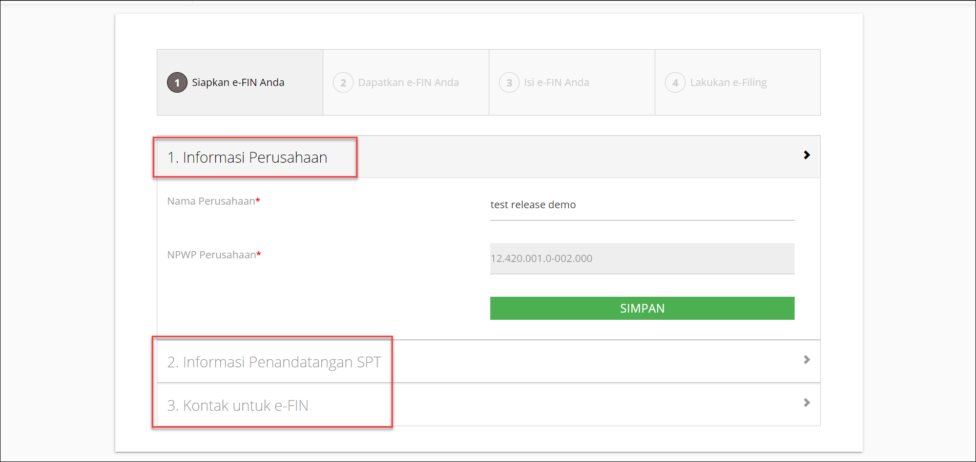 - Isi formulir secara online berupa informasi perusahaan, informasi penandatangan SPT dan kontak untuk E-FIN.